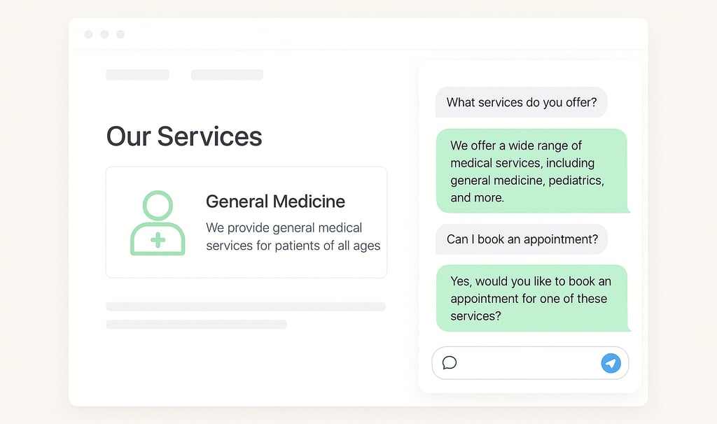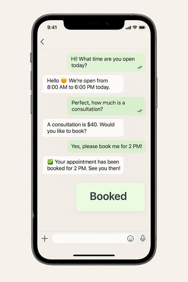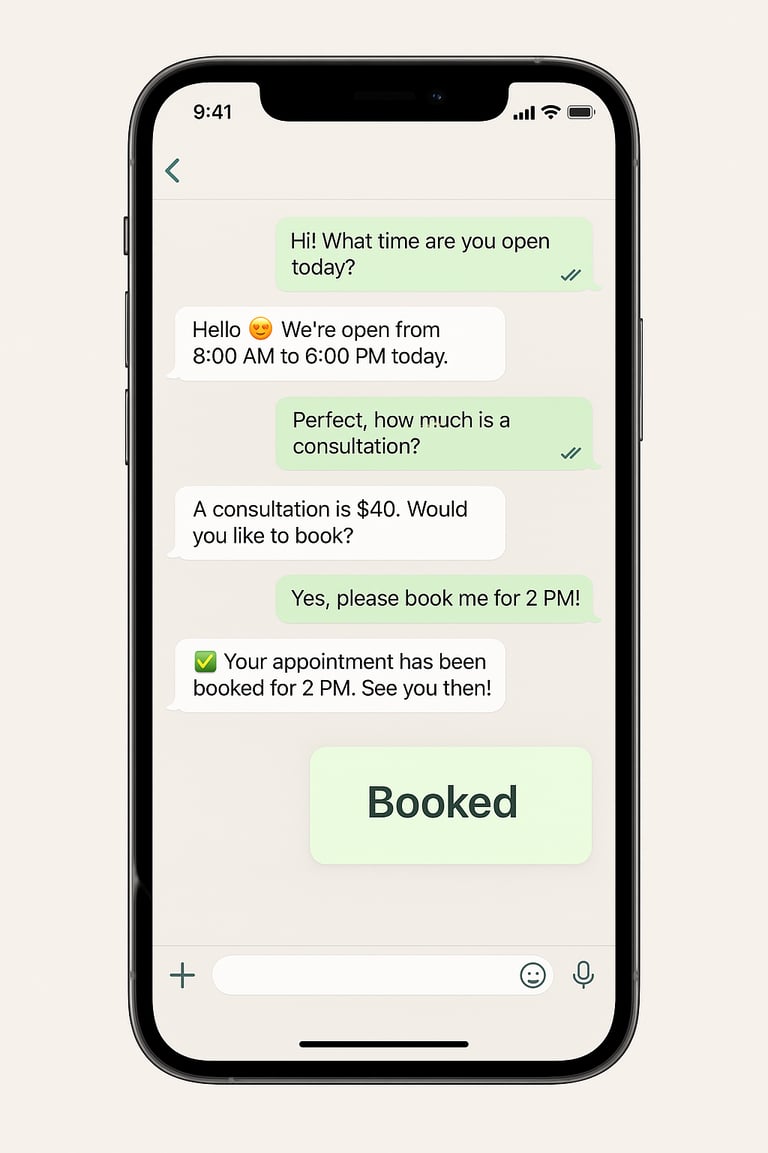 A WhatsApp bot answers FAQs, confirms availability, captures lead data, and hands off hot leads to sales — or books a follow-up call. WhatsApp Business APIs make this connection production-ready for medium/large businesses.